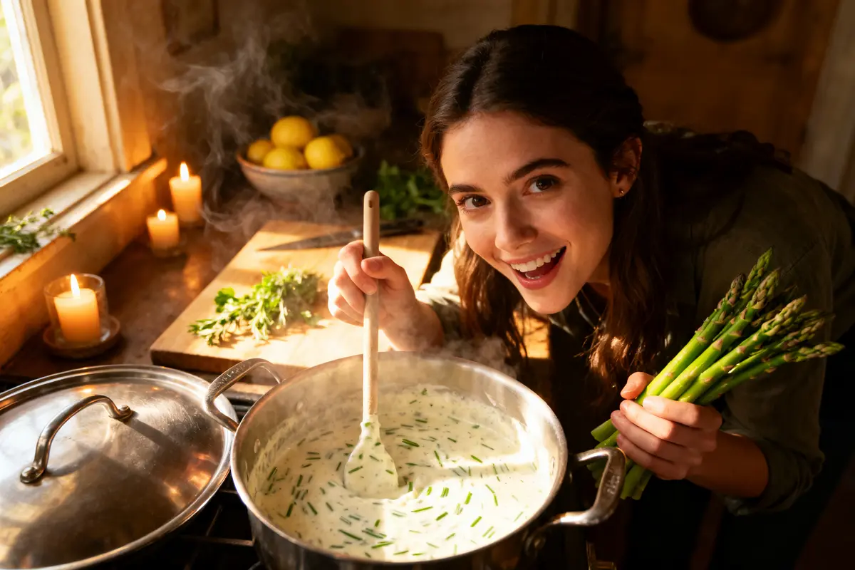 La sauce se prépare pendant la cuisson des asperges. Tout reste simple, mais la chaleur douce est essentielle.