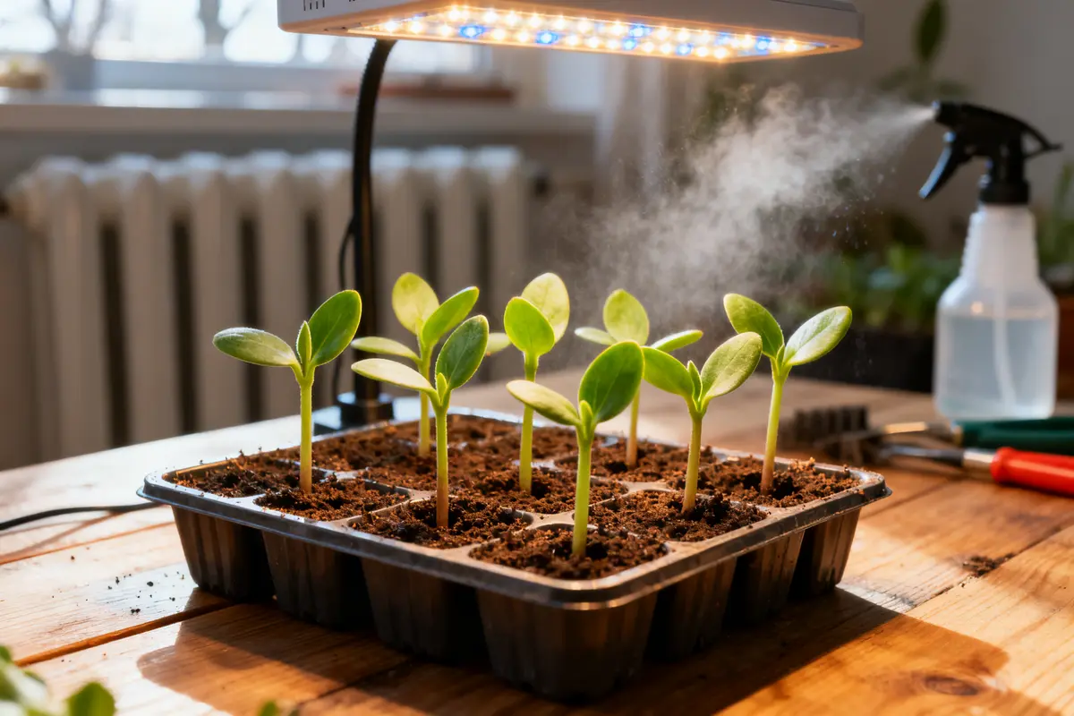 Le point décisif arrive dès que les cotylédons apparaissent. La chaleur ne suffit plus. La plante a besoin de lumière forte et stable. En février, même derrière une fenêtre plein sud, la lumière reste trop faible. C’est ici qu’intervient le micro-geste souvent oublié : installer une lampe horticole LED.