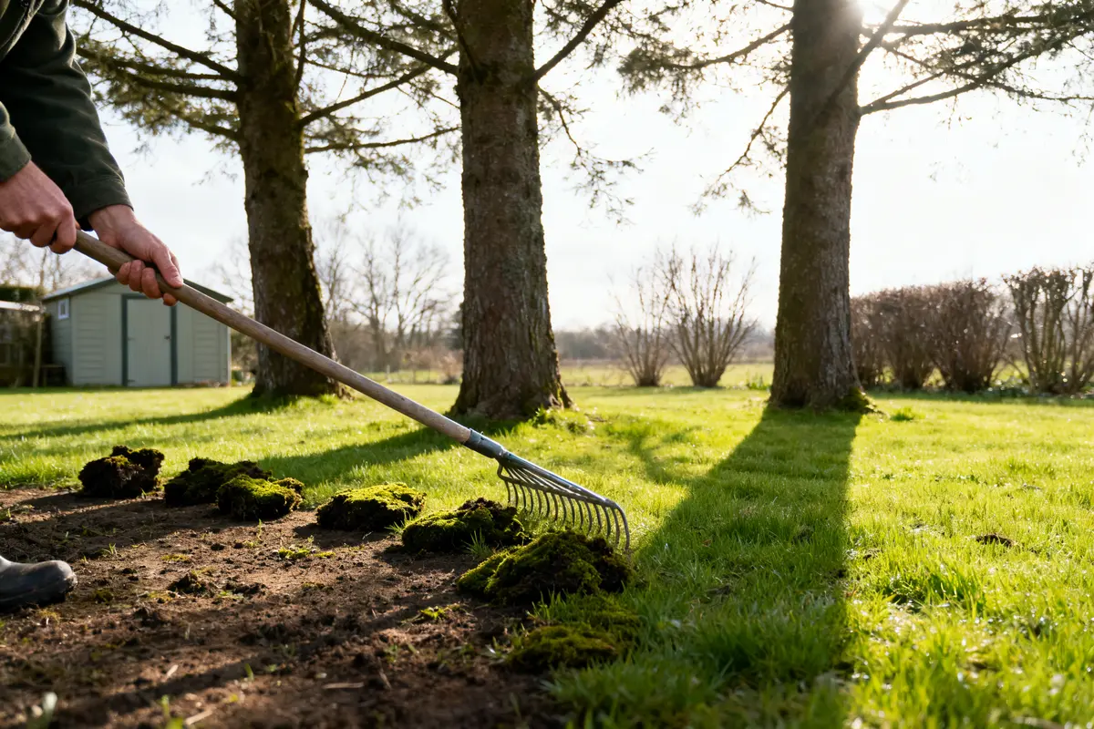 Il s’agit de tondre légèrement plus bas que d’habitude, puis de ratisser ou scarifier par temps sec. Ce geste retire la mousse sans blesser l’herbe encore saine. Une fois la surface dégagée, aérer le sol aide les racines à mieux respirer.