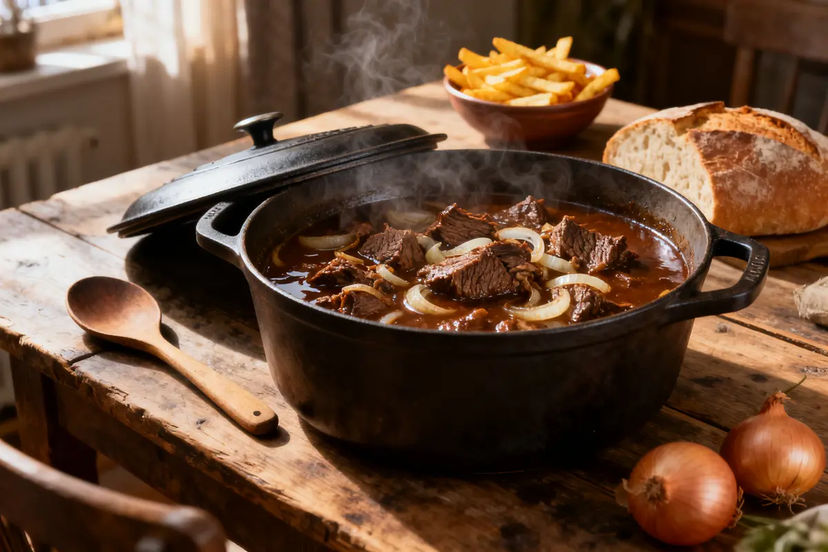 Ce plat du Nord fait partie de ceux qui changent l’ambiance d’une maison. Une odeur de bière brune, d’oignons fondus et de viande qui mijote longtemps. Vous préparez tout la veille, sans stress. Et le lendemain, impossible de ne pas se resservir. Voici votre carbonade flamande, généreuse et simple, pensée pour tout l’hiver.